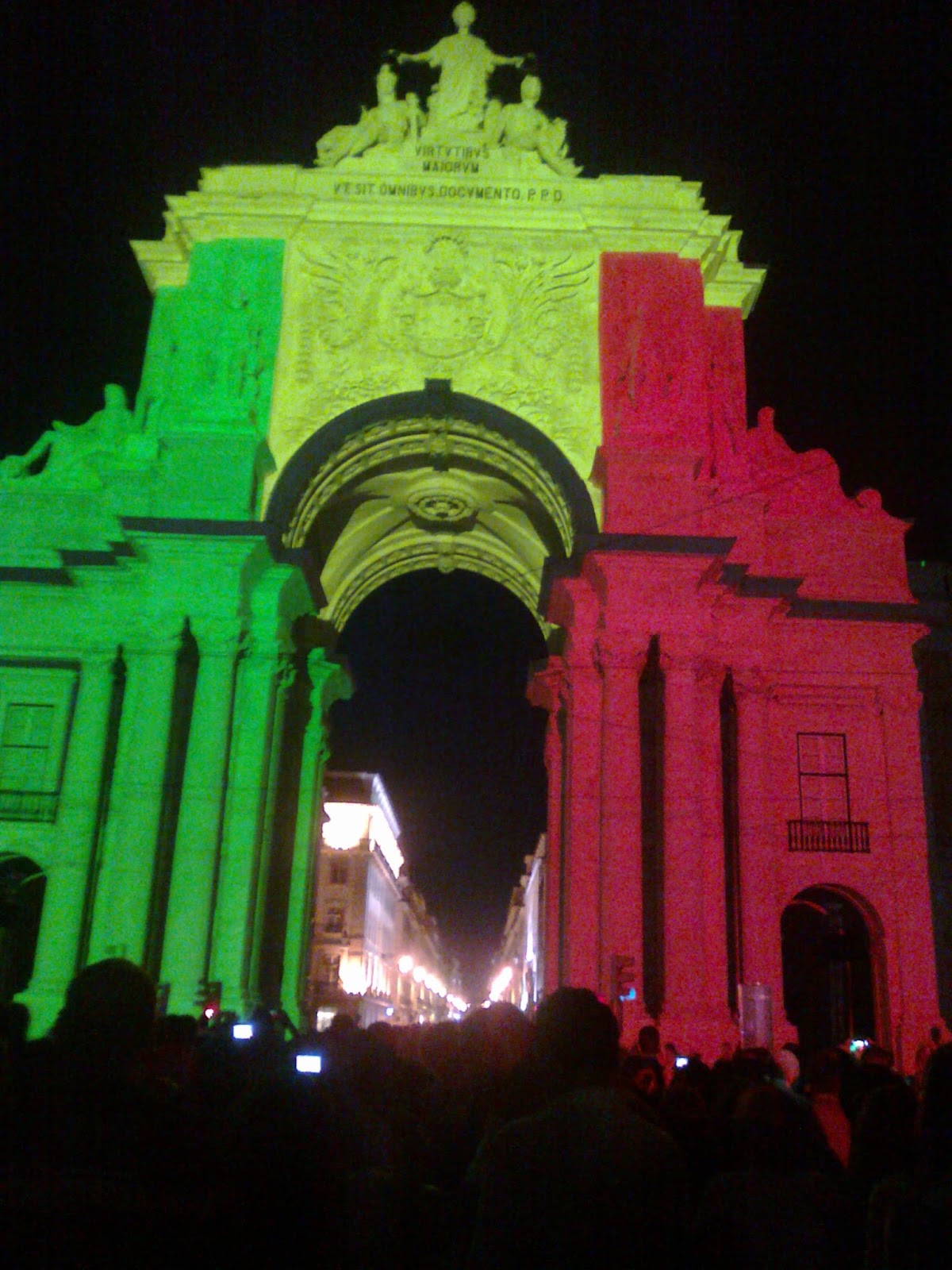 Fui ver as iluminações do arco. Umas são mais impressionantes do que outras e as fotografias que aqui mostro não são sequer do que mais me fez conter a respiração - que foram as do terramoto. O arco a abanar e o ruído, dá para acreditar que, no aspecto visual, o terramoto de 1755 não deve ter sido muito diferente daquilo, principalmente na baixa.